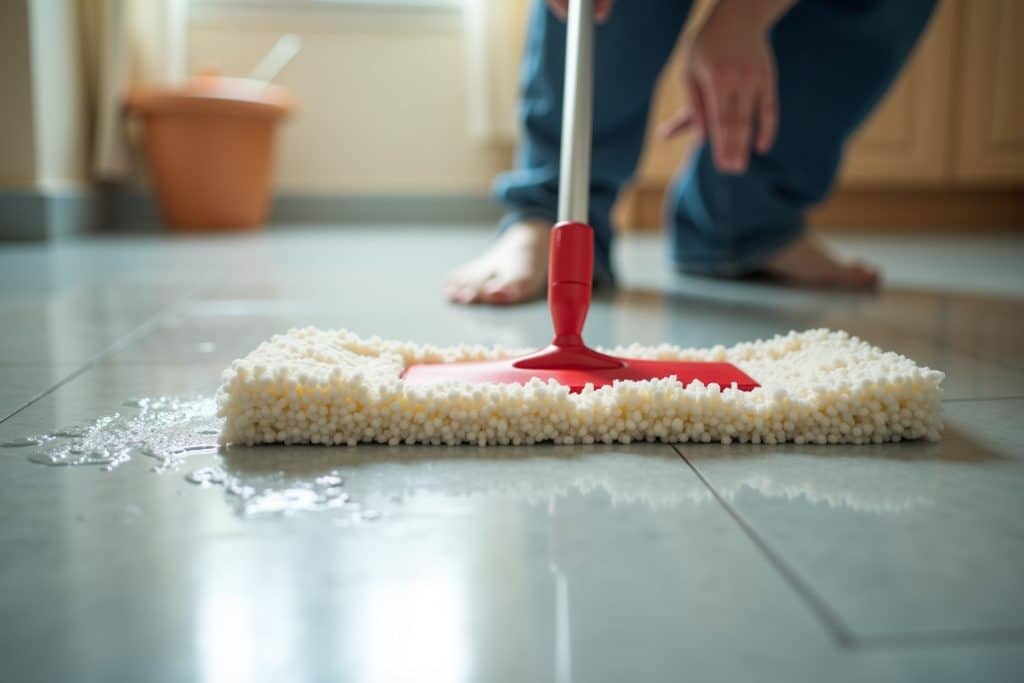 - Mopp oder Tuch befeuchten: Tauche einen Mopp oder ein weiches Baumwolltuch in das Wasser und wringe es gut aus. Der Mopp sollte feucht, aber nicht tropfnass sein.